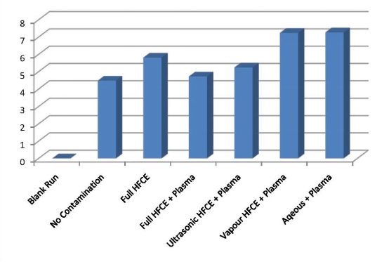 此外,縮短清洗流(liú)程(僅保留HFE超聲清洗+等離子清洗【ultrasonic HFE + plasma】)的樣品清(qīng)潔度優於完整HFE流程。這意味著傳(chuán)統HFE流程可(kě)簡化為兩步(超聲(shēng)+等離子清洗),仍能獲得更(gèng)高(gāo)清潔度的(de)表麵。